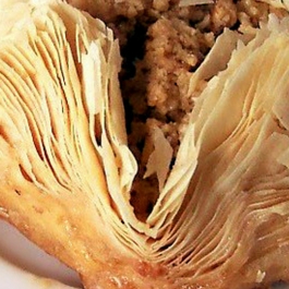 Phyllo pastry (or Filo to our American friends) has a disputed origin. The name means “leaf” pastry, which I’ll come back to later. If you accept that the earliest modern dish using it is baklava, it first appears in the Thirteenth Century, in the the Eastern Roman Empire. Baklava is basically interlayered flaky pastry and nuts, soaked in a syrup or honey. There are earlier dishes which seem something similar. Cato mentions a Roman dish called placenta which appears to be made out of honeyed leaves of pastry. Placenta just means “layered” and Cato calls an individual piece of pastry a “tractus”. There are also a few eastern European meat dishes, and a wrapped almond paste from further east. Regardless, baklava’s ancestors become prevalent in the written record just after the game period.