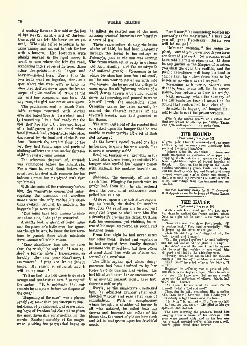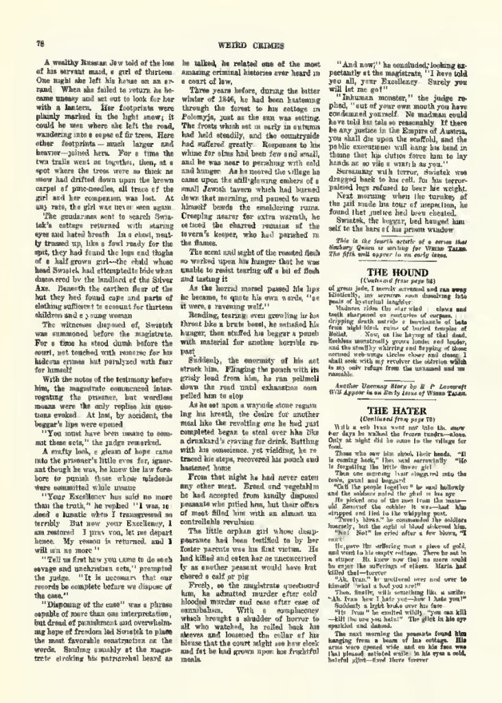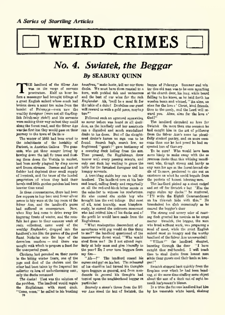 Seabury Quinn wrote nine articles – I believe – for Weird Tales magazine. He was the most prolific Weird Tales author. The nine weird crimes articles are different from his other work