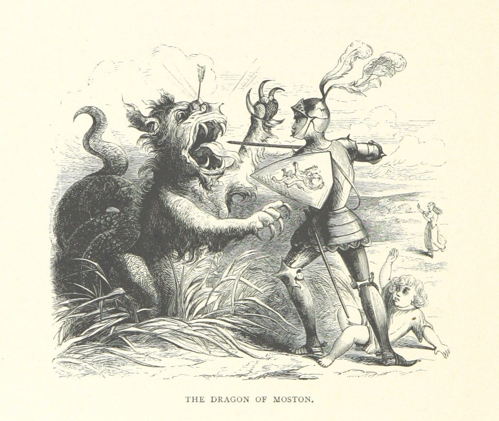 I wanted to wrote up the Moston Dragon as a a monster of the month, but the folklore surrounding it is not detailed enough to extend it past variation on the generic stats given in Realms of power Faerie (page). It is suitable for a combat encounter. The creature’s lair was at Dragon Lake. It had three layers of fangs, six claws on each foot, and had a tail strong enough to crush a bear. As dragons go this one was on the smaller but more ferocious end of the spectrum. A local nobleman weakened it by showering it with arrows, then finished it with a sword-thrust. It was a scaled dragon, and these are usually sufficiently armoured that arrows are little trouble for them, but not in this case, arguing for a lower Soak score.