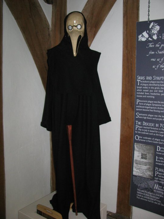 This photograph is of a plague doctor costume taken at Barley Hall in York. Add a wide brimmed hat and you can see that it is the physical template for one of the demons.